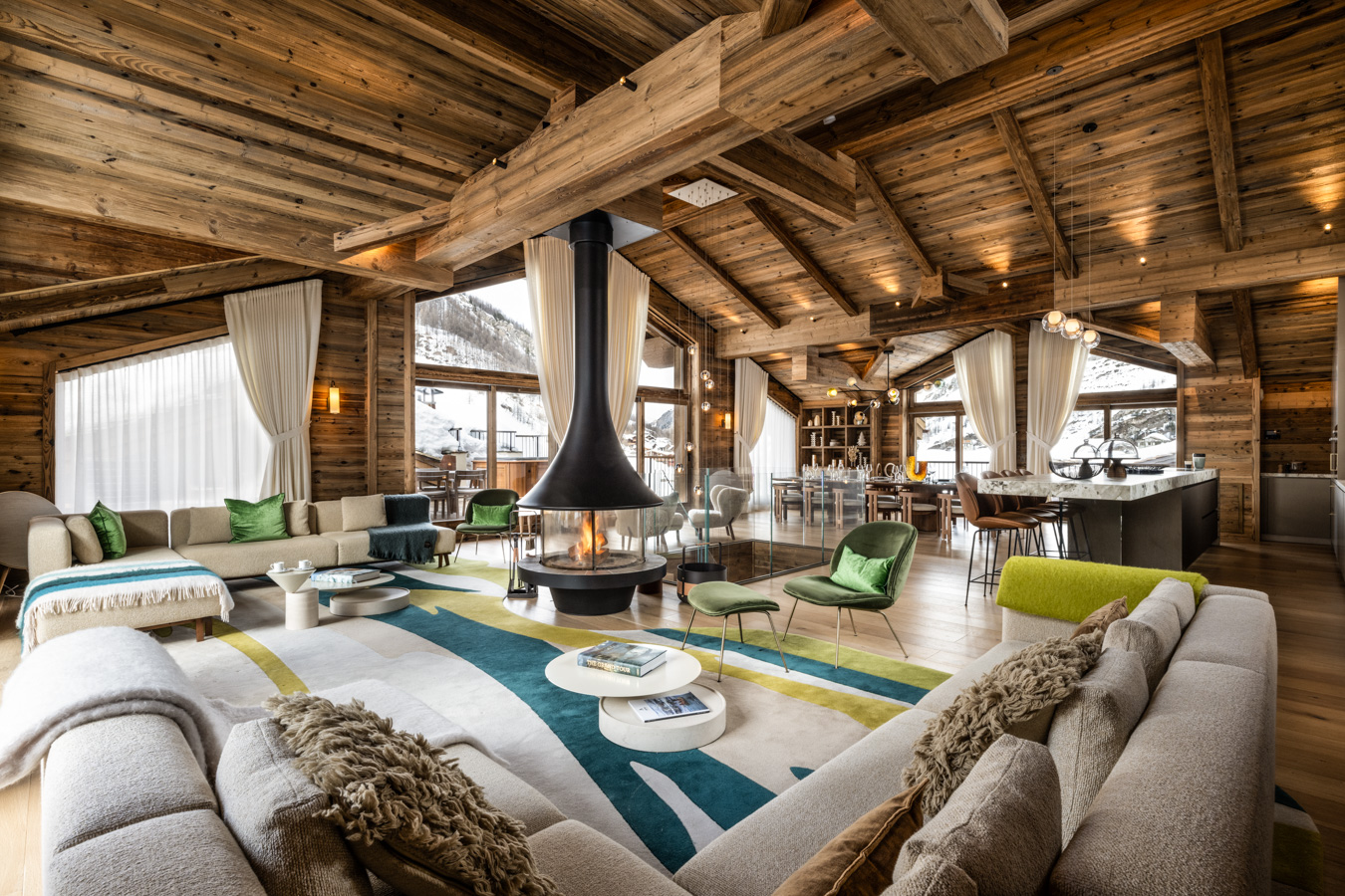 La Suite n°7 accueille jusqu’à 15 personnes, soit 14 adultes et 1 enfant. En plus des six chambres doubles et de la chambre dortoir enfants, elle offre au dernier niveau, une superbe pièce à vivre sur tout un étage, avec une impressionnante hauteur sous plafond. Le séjour s’articule autour d’une magnifique cheminée à bois centrale. Une grande cave à vins avec un bar, un espace repas et une cuisine toute équipée viennent compléter cette pièce. Cette Suite dispose également d'un lave-linge.